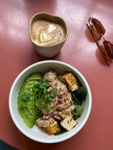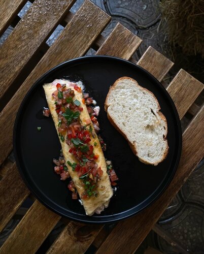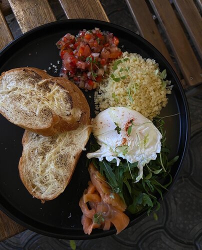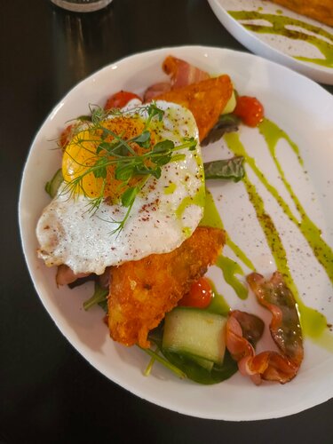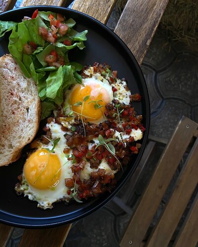 Завтрак с хашбрауном томатной сальсой и чем ни будь ещё + раф